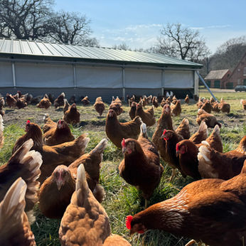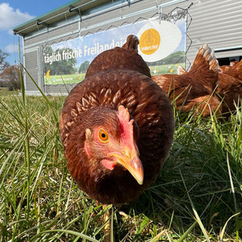 Gras, Kräuter, Würmer und Insekten gehören zu einer ausgewogenen Ernährung eines Huhns dazu und sind in frischen Weideflächen ausreichend vorhanden.
